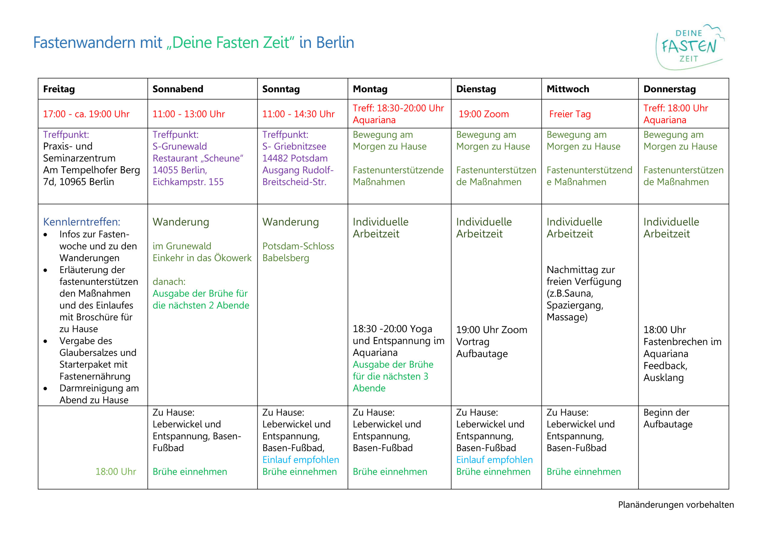 Wir bieten Dir berufsbegleitend das Fasten-Wandern nach Buchinger in Berlin an. Da wir die Fastenwoche ambulant durchführen, ist keine Unterkunft erforderlich. Du benötigst keinen Urlaub und kannst zuhause in deinem eigenen Tempo weiter arbeiten.